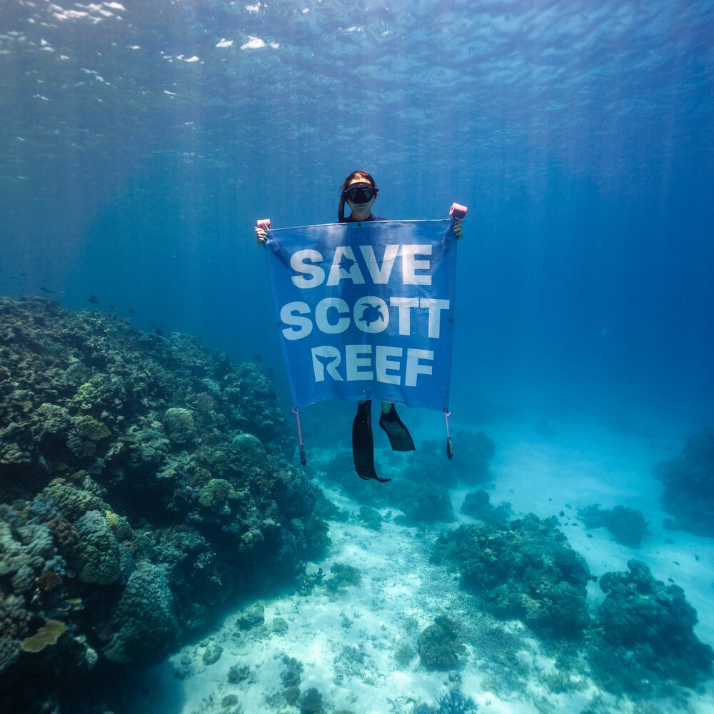 Photo by Nush Freedman, underwater images taken during the Save Scott Reef media trip with musician John Butler, author Tim Winton, free diver Brinkley Davies and ACF Climate Campaigner Piper Rollins.